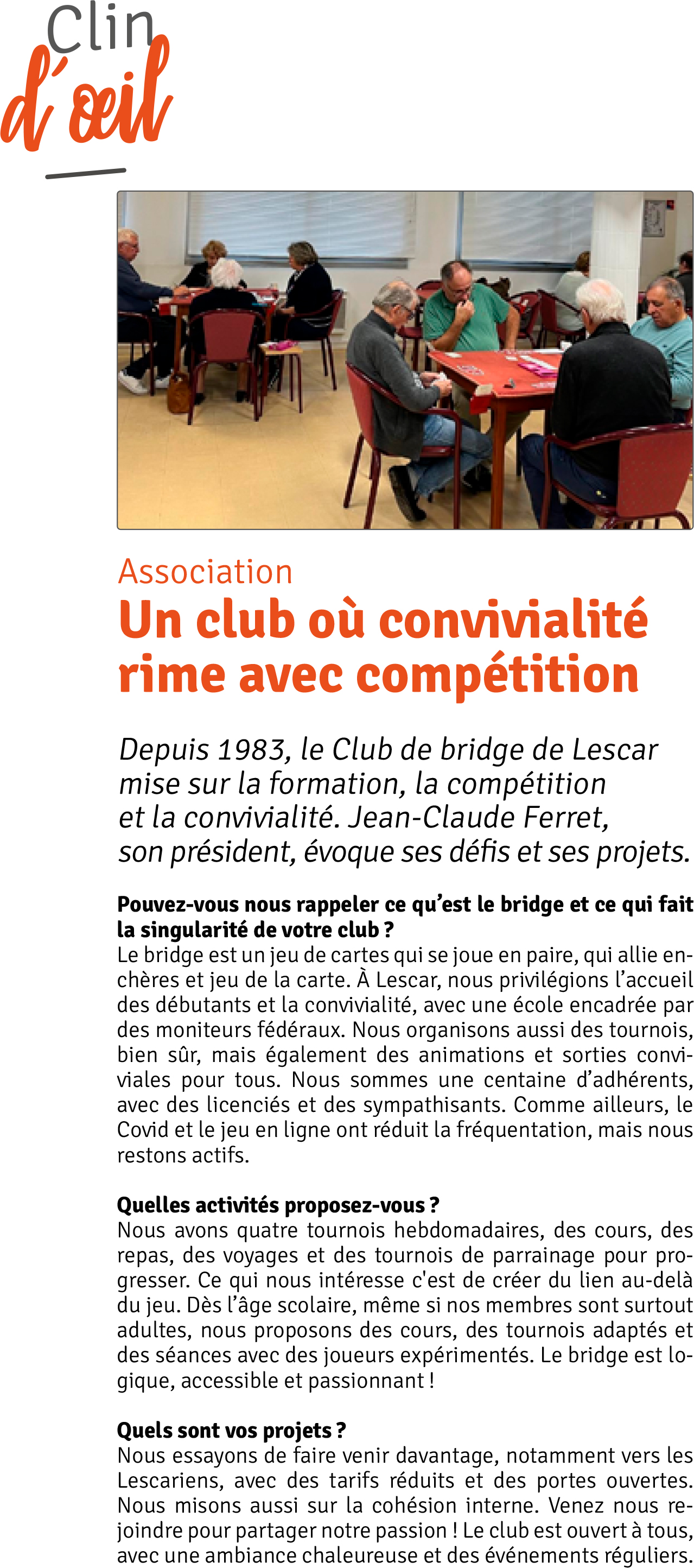 Deux articles sont parus en début d'exercice sur le club et ses activités. Le premier a été édité par les médias presse écrite "L'Eclair" et "La République des Pyrénées". pour lire l'article, cliquer ici ===> "Du jeu en toute convivialité avec le club de bridge". Le deuxième est paru sur le site internet de la Municipalité de Lescar dans une page du Mensuel d'Information de Lescar, le MIL. Pour voir la page, cliquer ici ===> "Un club où convivialité rime avec compétition"